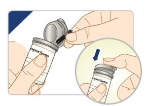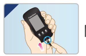 ntroduisez une bandelette Copersens® dans le lecteur (partie noire face à vous). Attendez 3 secondes jusqu’à l’apparition du symbole goutte de sang.