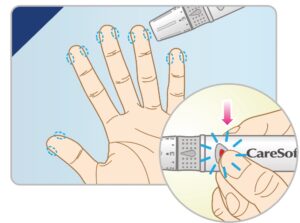 Insérez une lancette neuve dans l’autopiqueur, ajustez la profondeur (ex. niveau 3), puis armez le dispositif. Désinfectez votre doigt et laissez-le sécher avant la ponction.